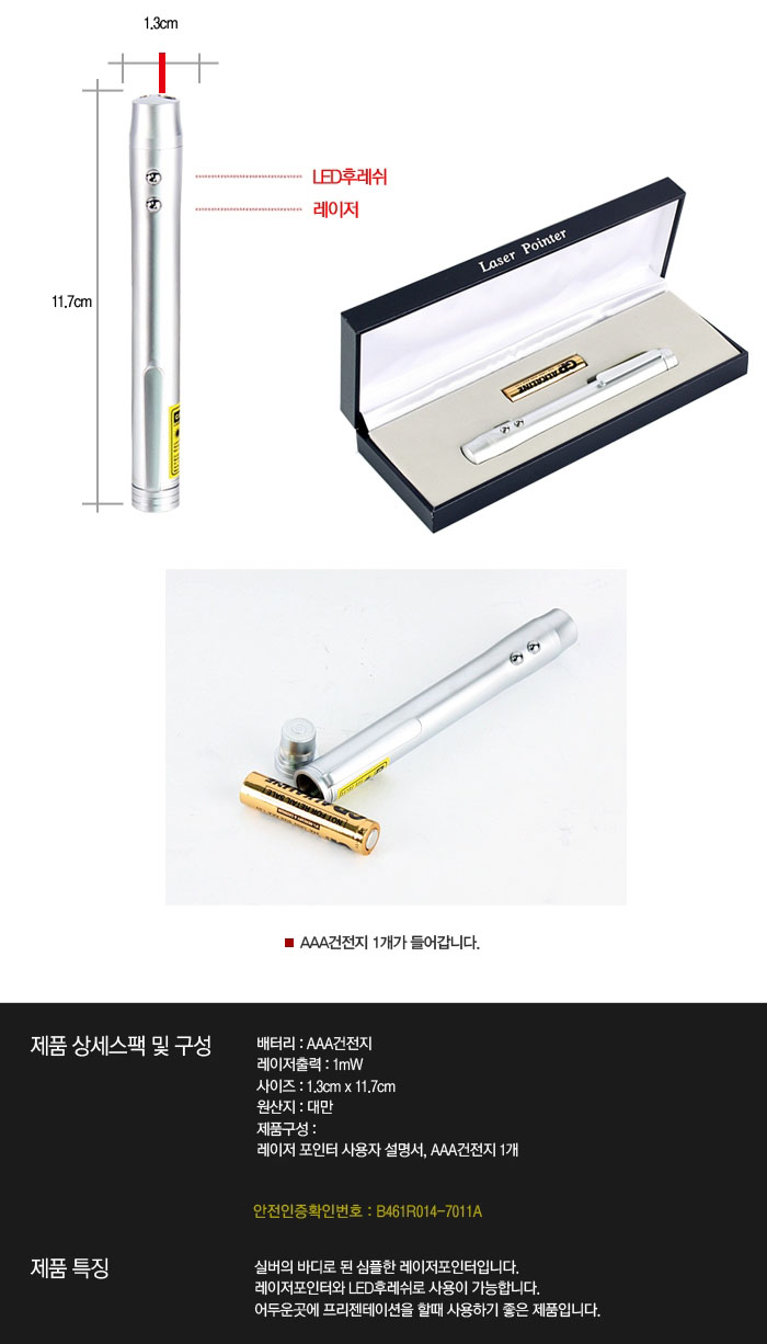 * 펜스타일 레이져 포인터 및 LED 후레쉬 기능의 신제품으로 일반 밧데리를 사용합니다.