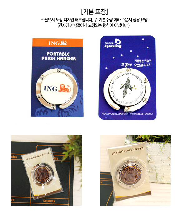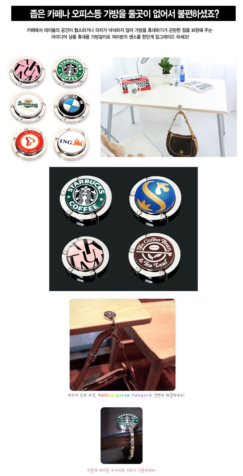 카페에서 테이블의 공간이 협소하거나 의자가 넉넉하지 않아 가방을 휴대하기가 곤란한 점을 보완해 주는 아이디어 상품 휴대용 가방걸이로 여러분의 센스를 한단계 업그레이드 하세요!