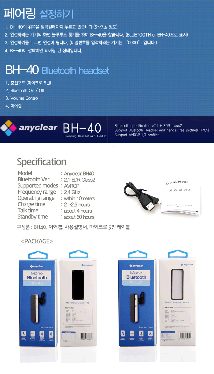 구성품 : BH40, 이어캡, 사용설명서, 충전케이블